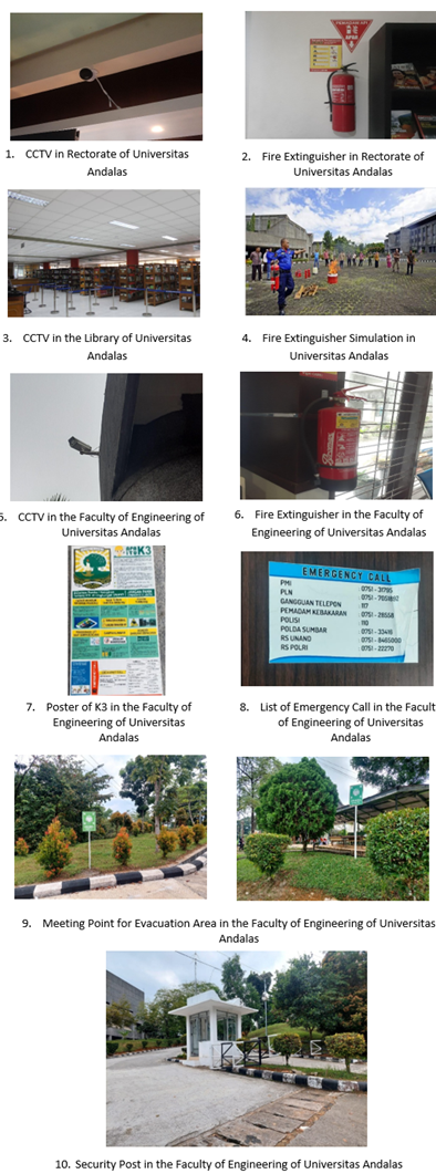 In response to the COVID-19 pandemic, Universitas Andalas implemented several public health and safety measures, including the installation of handwashing stations and occupational health and safety (K3) posters at the entrances of each building, initiatives that continue to be maintained today. Each building is also equipped with a clearly displayed emergency contact list for quick access in case of emergencies. Outside the buildings, the campus provides a designated assembly point that functions both as an evacuation area and a security checkpoint to monitor access to campus grounds. Security posts are strategically located across critical areas to maintain order and ensure rapid response when needed.