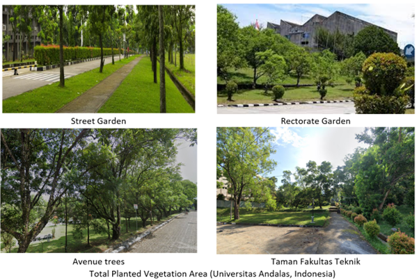 With a total planted vegetation area of 780,137 square meters out of the university’s 4,711,979 square meter land area, these cultivated landscapes account for around 10–20% of the total campus area. The avenue trees provide natural shading along pedestrian and vehicular pathways, improving microclimate comfort and enhancing visual coherence across the university grounds. Meanwhile, the faculty gardens function as green buffers that enrich the academic environment and offer pleasant outdoor spaces for study and social interaction.