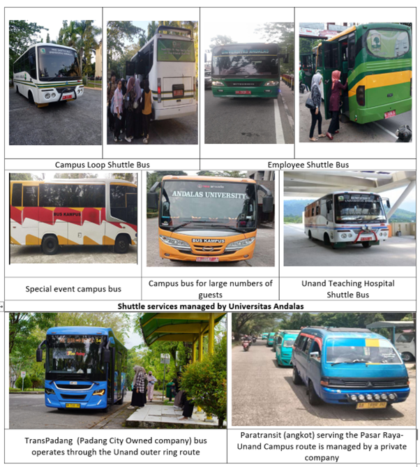 There are four types of shuttle buses operated by Unand to serve the mobility of the campus community: